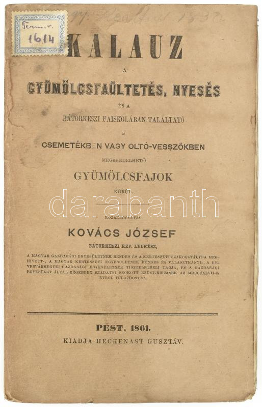 Kovács József: Kalauz a gyümölcsfaültetés, nyesés és a bátorkeszi faiskolában található s csemetékben vagy oltó-vesszőkben megrendelhető gyümölcsfajok körül. Közrebocsájtja - - bátorkeszi ref. lelkész. A szerző, Kovács József (1807-1888) ref. lelkész, gyümölcskertész által Pólya József (1802-1873) orvosdoktor, fizikus és kórházi főorvos, rajzoló, természettudós, pomológus, MTA tag részére DEDIKÁLT példány! Pest, 1861, Heckenast Gusztáv, IV+232 p. Kiadói papírkötésben, régi intézményi bélyegzőkkel, a borítón címkével, foltos lapokkal. Felvágatlan lapokkal! Ritka!