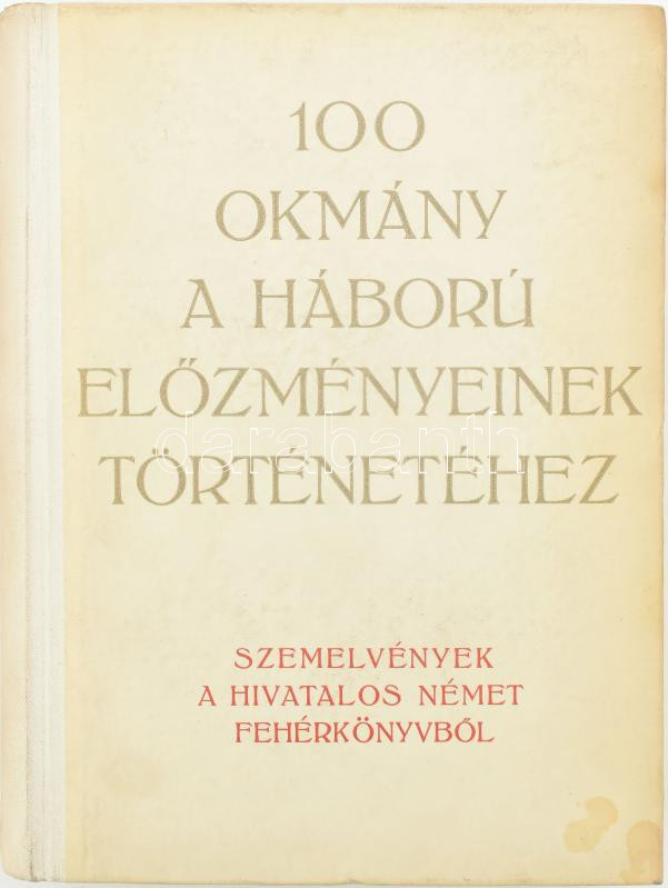 100 okmány a háború előzményeinek történetéhez. Szemelvények a hivatal... https://www.darabanth.com/en/464-Online-auction/464.0/Books/Books-History~2000086/100-okmany-a-haboru-elozmenyeinek-tortenetehez-Szemelvenyek-a-hivatalos-nemet-feherkonyvbol-Von~II3126533