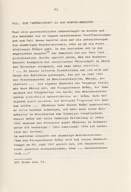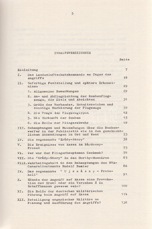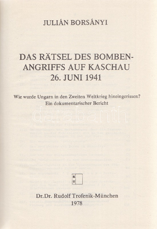 Borsányi, Julián: Das Rätsel des Bombenangriffs auf Kaschau 26. Juni 1941. Wie wurde Ungarn in den Zweiten Weltkrieg hineingerissen? Ein dokumentarischen Bericht. München, 1978. Rudolf Trofenik (Druck: Strauss & Cramer GmbH, Hirschberg). 260 p. Borsányi Julián okleveles gépészmérnök, katonatiszt, a kassai bombázást kivizsgáló bizottság egyik tagja, majd ,,Bell ezredes" néven a Szabad Európa Rádió katonai hírmagyarázója volt. Emigrációjában írt könyvében alaposan körüljárja a kassai bombázás kérdését, melyet a hivatalos, moszkovita irányzatú magyarországi történetírás már 1945 óta leegyszerűsítve értelmezett, a kassai bombázást a magyar-német cinkosság perdöntő bizonyítékának hirdetve. Borsányi Julián ebben a kötetben az ügyet - leegyszerűsítő magyarázatok nélkül - a maga összetettségében vizsgálja. A kötet 1985-ben magyar nyelven is megjelent, szintén Münchenben. Oldalszámozáson belül hét térképvázlattal, hivatalos iratok hasonmásaival. (Studia Hungarica. Schriften des Ungarischen Instituts München. 16.) Kiadói egészvászon kötésben. Jó példány.
