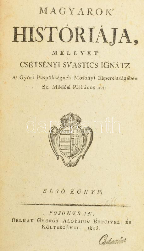 [Csécséni Svastics Ignác] Csétsényi Svastics Ingátz: Magyarok' históriája, ... 1. könyv. Posonyban, 1805, Belnay György Aloysius', 16+380+3 p. Korabeli aranyozott gerincű félvászon-kötésben, kissé kopott borítóval, hiányzó címképpel.