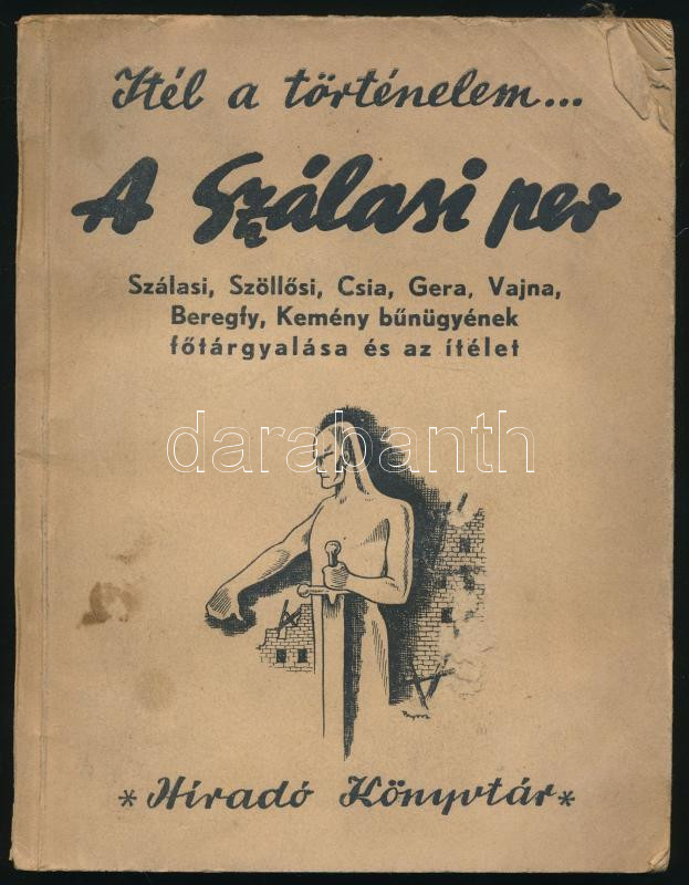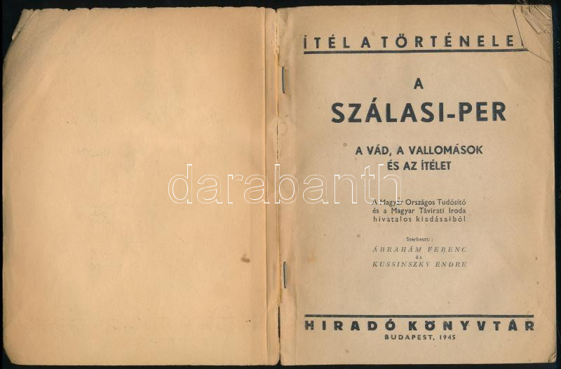 Ítél a történelem. A Szálasi-per. A vád, a vallomások és az ítélet. Szerk.: Ábrahám Ferenc, Kussinszky Endre. Híradó Könyvtár. Bp., 1945, Magyar Központi Híradó Rt. (Forrás-ny.), 191+1 p. A borító Byssz Róbert munkája. Kiadói papírkötés, kissé foltos, kissé sérült borítóval, a lapok felső sarkain szamárfülekkel.