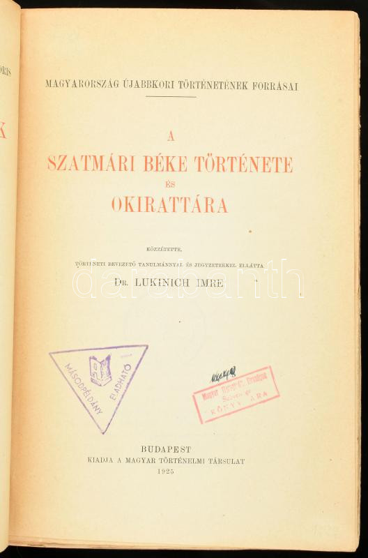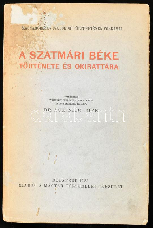 Lukinich Imre: A szatmári béke története és okirattára. Közzétette, történeti bevezető tanulmánnyal és jegyzetekkel ellátta - -. Magyarország újabbkori történetének forrásai - Fontes Historiae Hungaricae Aevi Recentoris: Hivatalos iratok és levelek. [Bp.], 1925., Magyar Történelmi Társulat,(Egyetemi-ny.), VII+633+1 p. + 2 t. Kiadói papírkötés, foltos borítóval, régi intézményi bélyegzésekkel, két lapszélén szöveget nem érintő sérülésekkel. Felvágatlan példány!