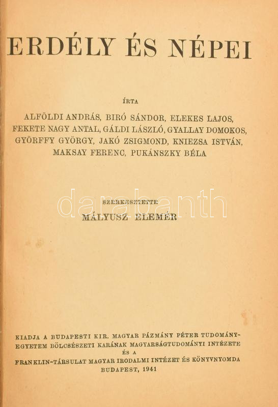 Mályusz Elemér: Erdély népei. Írta: Alföldi András, Biró Sándor, Elekes Lajos, Fekete Nagy Antal, Gáldi László, Gyallay Domokos, Györffy György, Jakó Zsigmond, Kniezsa István, Maksay Ferenc, Pukánszky Béla. Szerk.: - -. Bp., 1941, Budapesti Kir. M. Pázmány Péter Tudományegyetem Bölcsészeti Karának Magyarságtudományi Intézete - Franklin, 254+2 p.+4 t. Átkötött egészvászon-kötés, egy térképlap kijár, ceruzás aláhúzásokkal és bejelölésekkel.