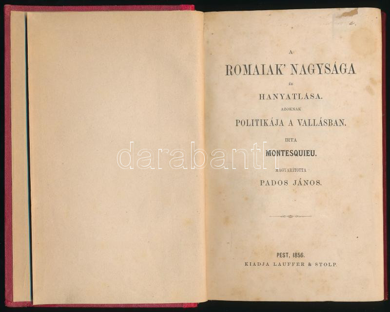Montesquieu: A rómaiak' nagysága és hanyatlása azoknak politikája a va... https://www.darabanth.com/en/464-Online-auction/464.0/Books/Books-History~2000086/Montesquieu-A-romaiak-nagysaga-es-hanyatlasa-azoknak-politikaja-a-vallasban-Irta-~II3129569