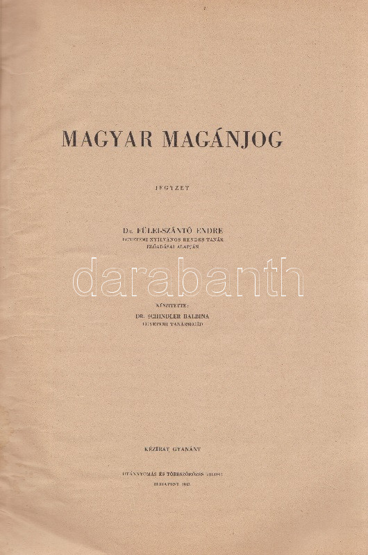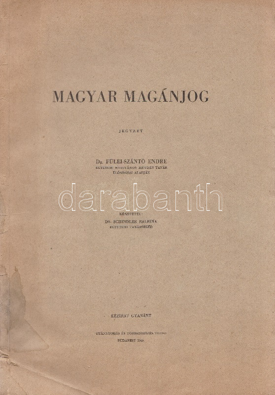 Magyar magánjog. Jegyzet. Füle... https://www.darabanth.com/en/464-Online-auction/464.0/Books/Books-Law~2000087/Fulei-Szanto-Endre-Schindler-BalbinaMagyar-maganjog-Jegyzet-Fulei-Szanto-Endre-egyetemei~II3128185