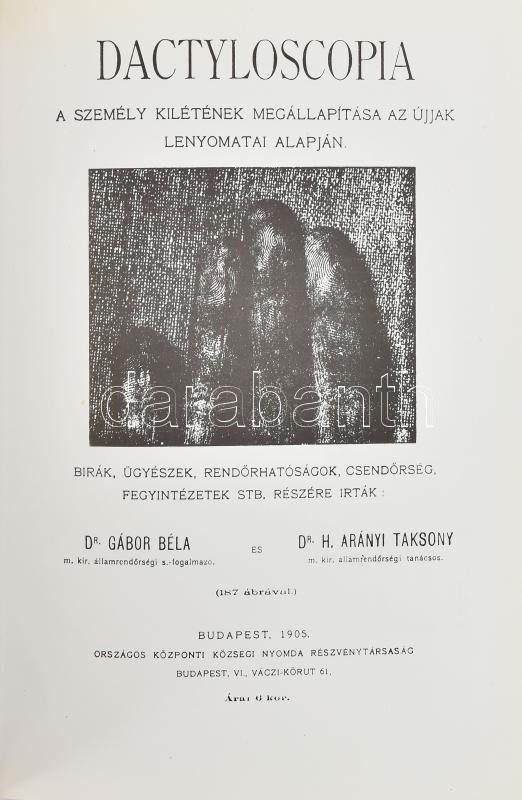 Gábor Béla - H. Arányi Taksony: Dactyloscopia. A személy kilétének meg... https://www.darabanth.com/en/464-Online-auction/464.0/Books/Books-Law~2000087/Gabor-Bela-H-Aranyi-Taksony-Dactyloscopia-A-szemely-kiletenek-megallapitasa-az-ujjak~II3092517