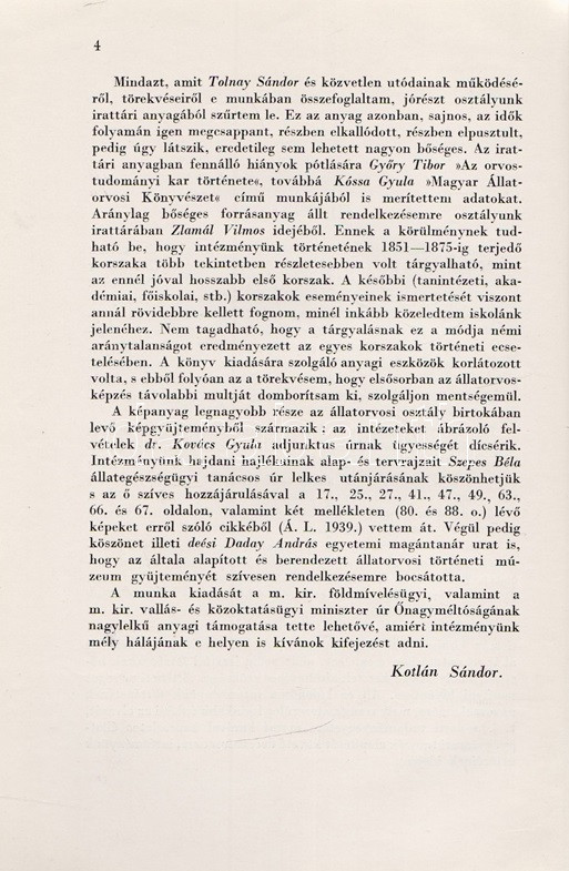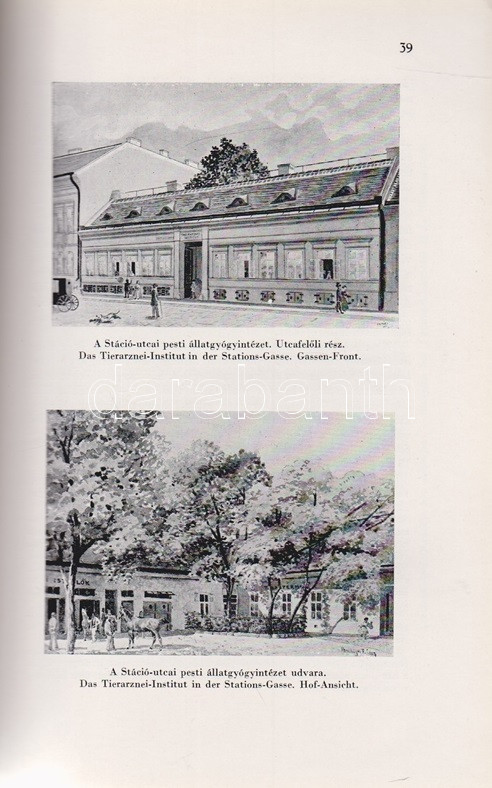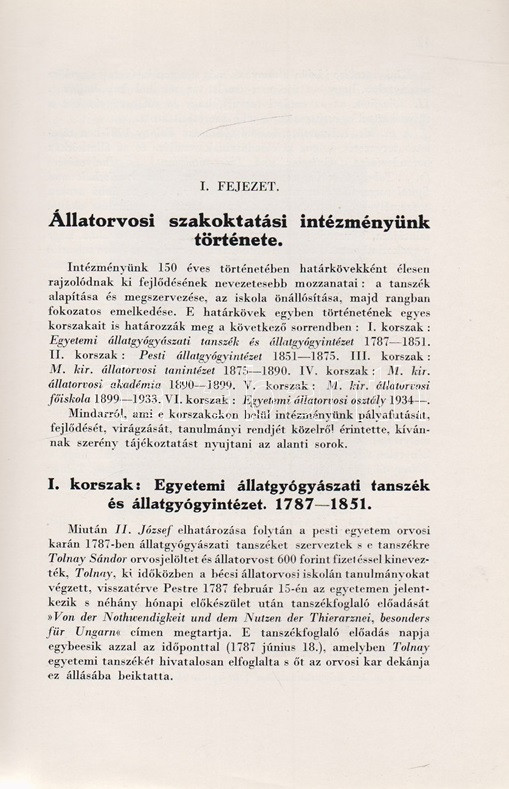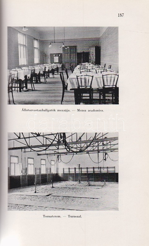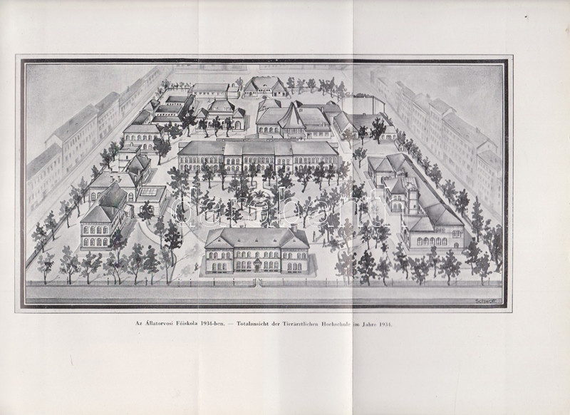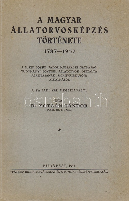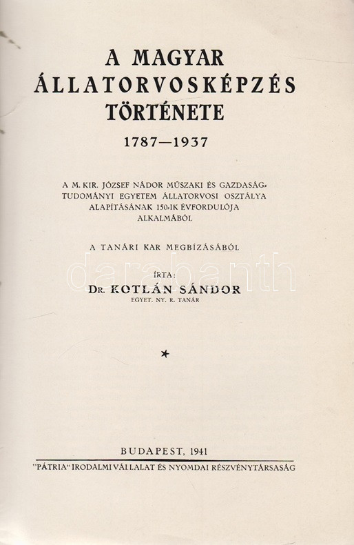 Kotlán Sándor: A magyar állatorvosképzés története 1787-1937. A M. Kir. József nádor Műszaki és Gazdaságtudományi Egyetem Állatorvosi Osztálya alapításának 150-ik évfordulója alkalmából írta Kotlán Sándor. Budapest, 1941. (Szerző) ,,Pátria" Irodalmi Vállalat és Nyomdai Rt. 210 p. + 12 t. (3 kihajtható). Egyetlen kiadás. A Pestre költöztetett egyetem orvosi karán 1787-ben indult meg az állatorvos-tudományi képzés, az intézmény 1790-től már - a tudomány hazai nagy jelentőségére való tekintettel - önálló Intézetként működött. Kotlán Sándor munkája áttekinti a számos intézményváltáson áteső és számos alkalommal költöző felsőoktatási intézmény történetét, valamint bemutatja erzsébetvárosi campusát, azt a helyet, amelyen az azóta ismét önállósult Állatorvos-tudományi Egyetem ma is működik, az intézmény korábbi világhírű tanárai alapján elnevezett utcák környékén (Marek József, Hutyra Ferenc). Oldalszámozáson belül gazdag szövegközti képanyaggal, campus-fotókkal és egyetemi helységekről készült felvételekkel. BOEH VIII: 1626. Fűzve, kiadói borítóban. Jó példány.