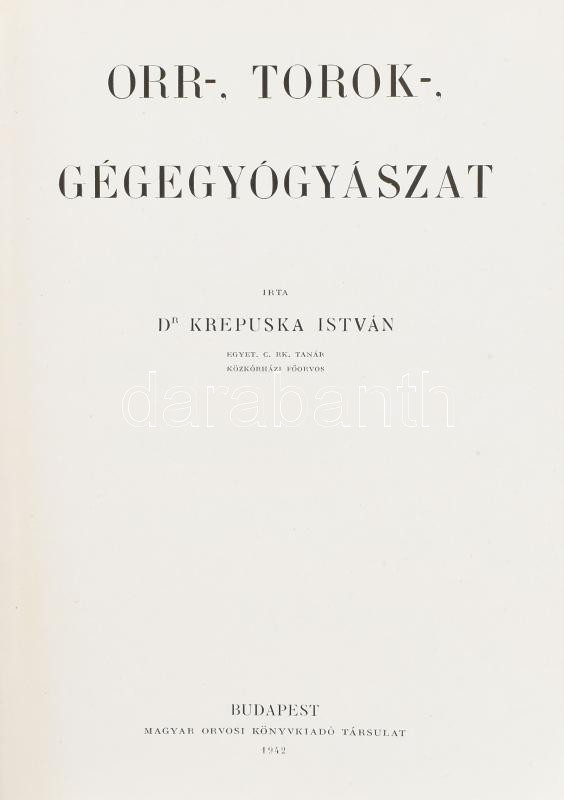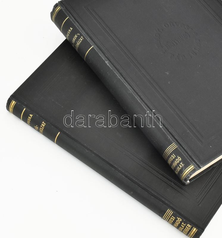 Magyar Orvosi Könyvkiadó Társulat. + Krepuska István: Orr-, torok-, gégegyógyászat. Bp., 1942., Magyar Orvosi Könyvkiadó Társulat. Kiadói aranyozott gerincű egészvászon-kötések, kissé kopott borítókkal.