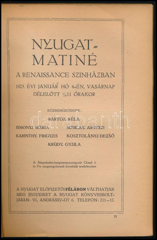 Description: 1924 Nyugat. 1924. dec. 20., XVII. évf. 24. sz. Karácsonyi szám. Bp., 1924, Pallas, 3+736-811+1 p. Benne Kosztolányi Dezső: Tizenhárom új vers c. írásokkal. Restaurált kiadói papírkötés.