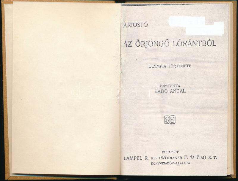 Ariosto: Az őrjöngő Lórántból. Olympia története. Ford.: Radó Antal. B... https://www.darabanth.com/en/464-Online-auction/464.0/Books/Books-Other-rarities~1500033/Ariosto-Az-orjongo-Lorantbol-Olympia-tortenete-Ford-Rado-Antal-Bp-en-Lampel-R-Wodianer-F~II3129627