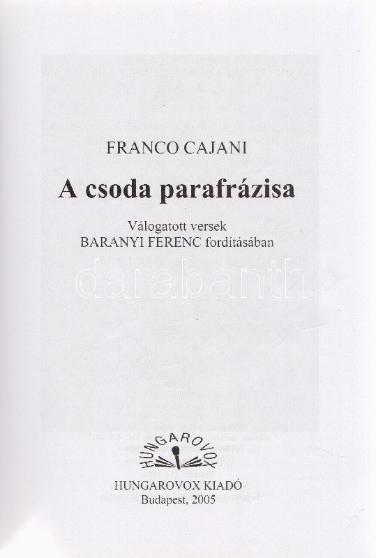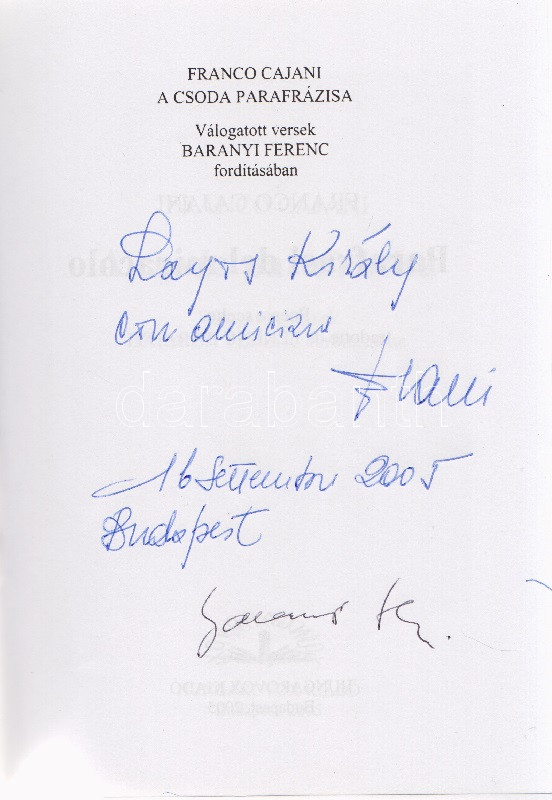 Dedikált: ,,Lajos Király con amicizia: Cajani. 16 September 2005 Budapest" [Király Lajosnak barátsággal: Cajani]. A dedikáció alatt a műfordító Baranyi Ferenc aláírása. Olasz-magyar bilingvis verseskötet, a műfordító előszavával.