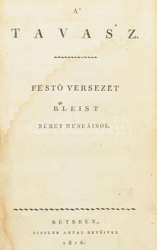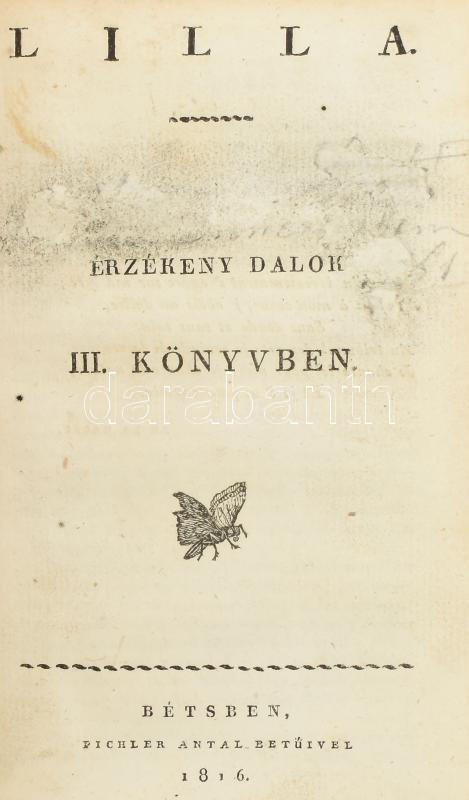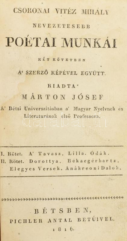 Csokonai Vitéz Mihály: - - - nevezetesebb poétai munkái. I. köt.: A' tavasz, Lilla, Ódák. A' szerző képével együtt kiadta Márton József, a Bétsi Universzitásban a' magyar nyelvnek és literaturának első professora. Bécs, 1816, Pichler Antal, 1 (Csokonai Vitéz Mihály arcképe) t. +XVI+224 p. Átkötött félvászon-kötésben, kopott borítóva, foltos lapokkal. Merkly Belus József (1886-1966). nagykanizsai gyógyszerész ex libris bélyegzésével és autográf possessori bejegyzéssel (Sipeky Béla Könyveiből 887?)
