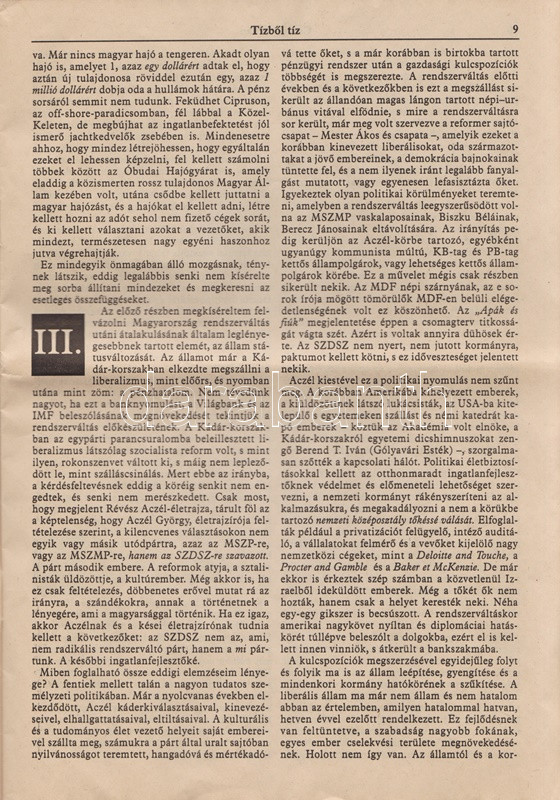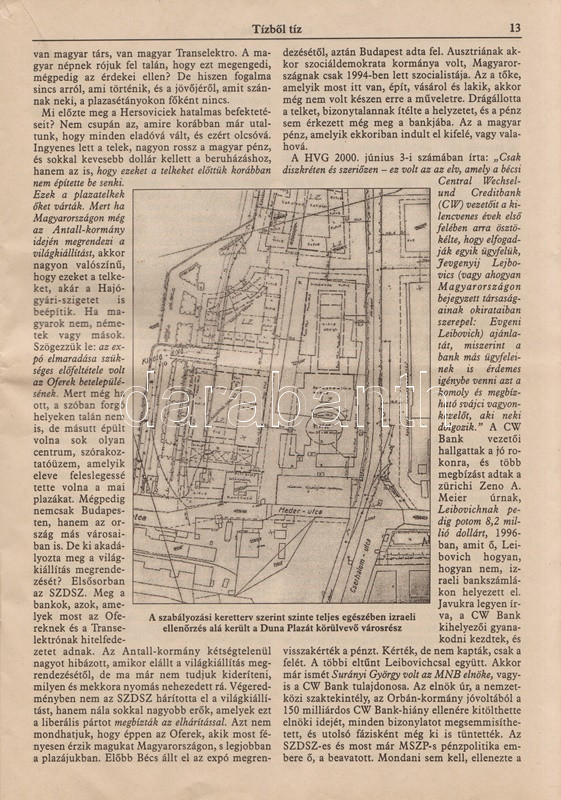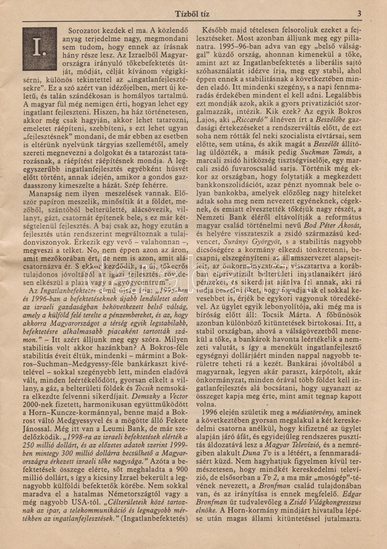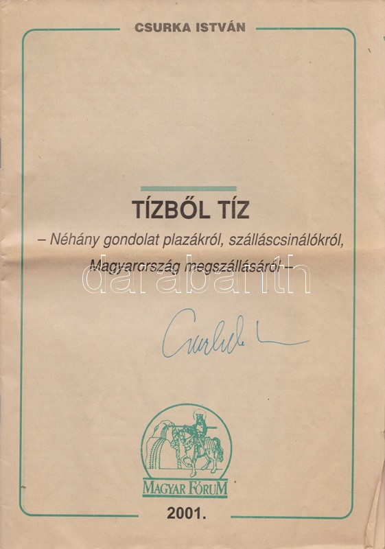 Csurka István: Tízből tíz. Néhány gondolat plazákról, szálláscsinálókról, Magyarország megszállásáról. 2001. Különlenyomat a Magyar Fórum 2001/26-31. számainak cikksorozatából. (Aláírt.) (Budapest), 2001. (Magyar Út Alapítvány - Kaposvári Nyomda Kft.) 31 + [1] p. A kétszínnyomású fedőborítón Csurka István saját kezű aláírása. Az összeesküvés-elmélet határait feszegető dolgozatában Csurka István a kádári nómenklatúra átöröklődéséről ír, az egykori kádárista másodvonalbeli vezető réteg privatizáció során történt feltőkésítéséről, a jelenben zajló ingatlanspekulációk és építkezések kapcsán pedig izraeli térfoglalást feltételez Budapesten, melynek következtében a tradicionális magyar civilizáció radikális megváltoztatásának szándékát is sejteti. Oldalszámozáson belül néhány szövegközti illusztrációval. Fűzve, illusztrált kiadói fedőborítóban, hajtogatásnyommal.