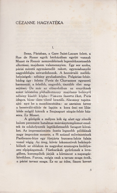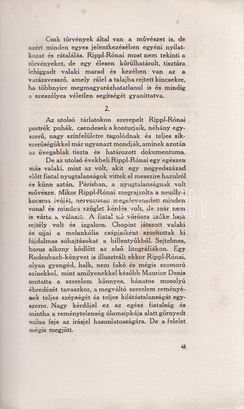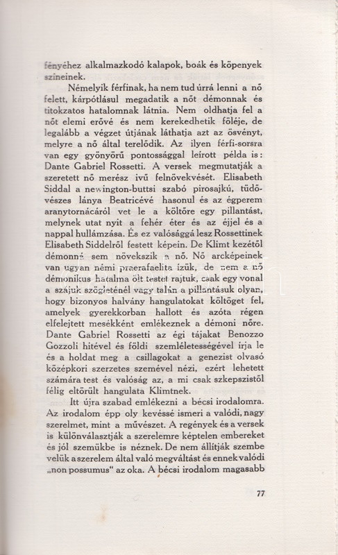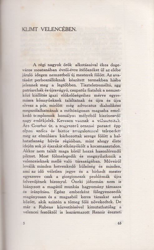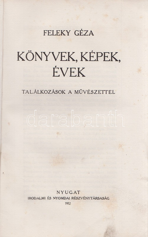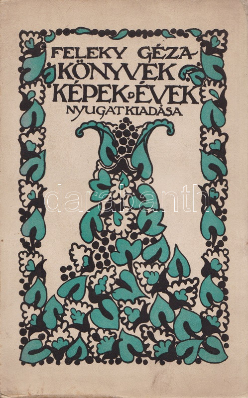 Feleky Géza: Könyvek, képek, évek. Találkozások a művészettel. Budapest, 1912. Nyugat Irodalmi és Nyomdai Rt. 239 + [1] p. Egyetlen kiadás. Feleky Géza újságíró (1890-1936) szubjektív képzőművészeti esszéi döntően a nyugati szecessziós festészet alkotóinak állítanak emléket. Az eredetileg a Nyugat folyóiratban megjelenő esszék többsége radikálisan kerüli az okfejtést és a logikai érvelést, illetve érvelés helyett egyéni benyomásokról ad leírást: a Nyugat első éveinek képzőművészeti kritikáit ez a kétségtelenül könnyed, ám elkent írásmód uralta. A címlevél előtti levélen apró szakadás, a címoldalon és a belív néhány oldalán apró, halvány foltosság. Fűzve, színes, illusztrált, szecessziós kiadói borítóban. Körülvágatlan példány.