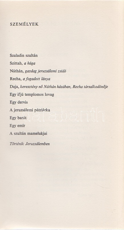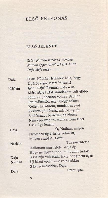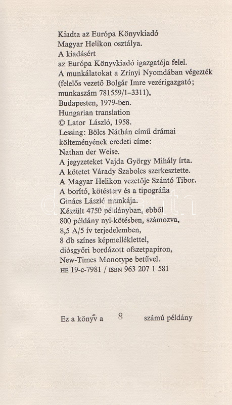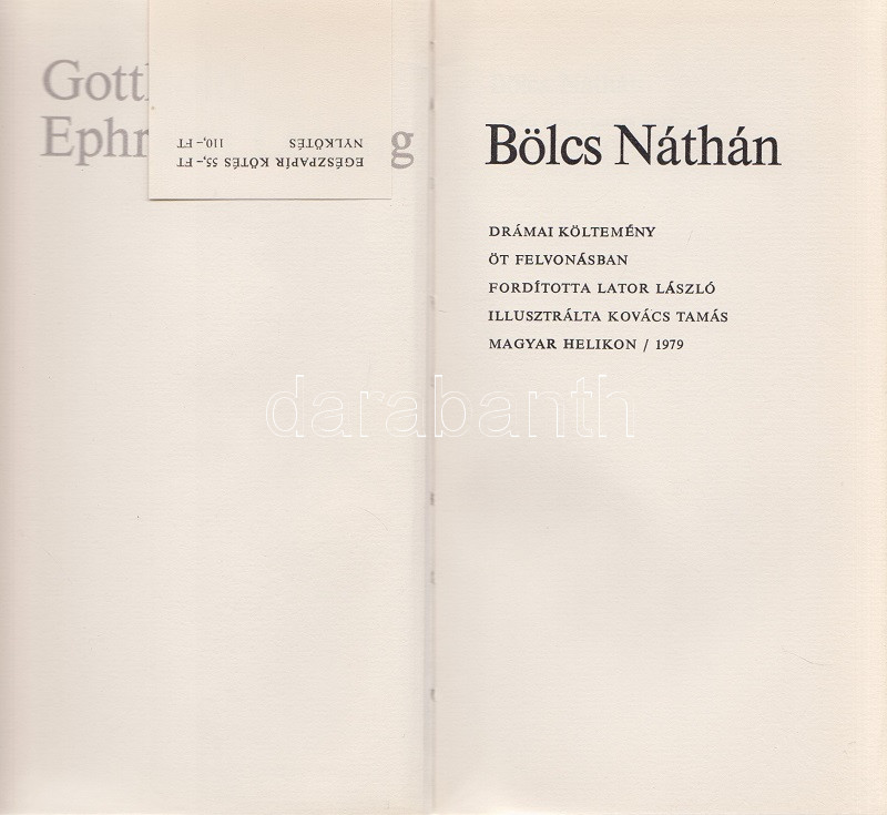 Lessing, Gotthold Ephraim: Bölcs Náthán. Drámai költemény öt felvonásban. Fordította Lator László. (Számozott.) [Budapest], 1979. (Európa Könyvkiadó Magyar Helikon osztálya (Zrínyi ny.) 165 + [3] p. + 8 t. (színes, duplaoldalas). Számozott példány, sorszáma: 8. A borító, a kötésterv és a tipográfia Ginács László munkája, illusztrálta Kovács Tamás. (Magyar Helikon.) Aranyozott, kiadói nyl-kötésben, Kovács Tamás grafikájával illusztrált kiadói védőborítóban. Szép példány.