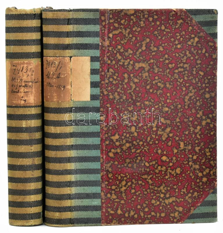 MTA cím- és tartalomjegyzékek, 2 kötet: A Magyar Tud. Akadémia kiadásában megjelent munkák és folyóiratok betűrendes czim- és tartalomjegyzéke. (1830-1889. június hó végéig). Bp., 1890, MTA (Hornyánszky-ny.), 502 p. + A Magyar Tud. Akadémia kiadásában megjelent munkáknak és a folyóiratok tartalmának betűrendes czímjegyzéke. 1889-1910. II. rész. Bp., 1911, MTA, 593-1188 p. Félvászon-kötésben, helyenként sérült, a fűzéstől elváló lapokkal, intézményi bélyegzőkkel.