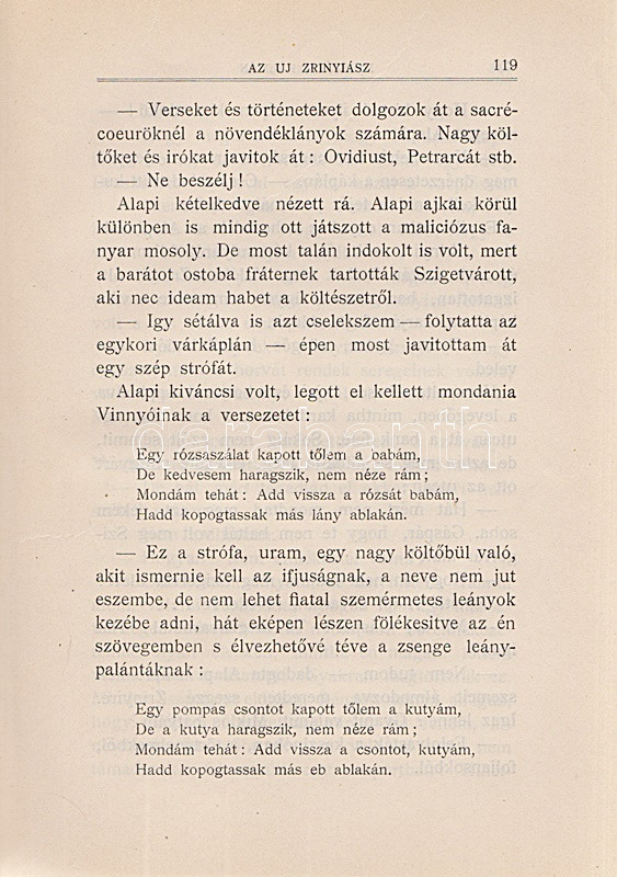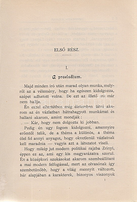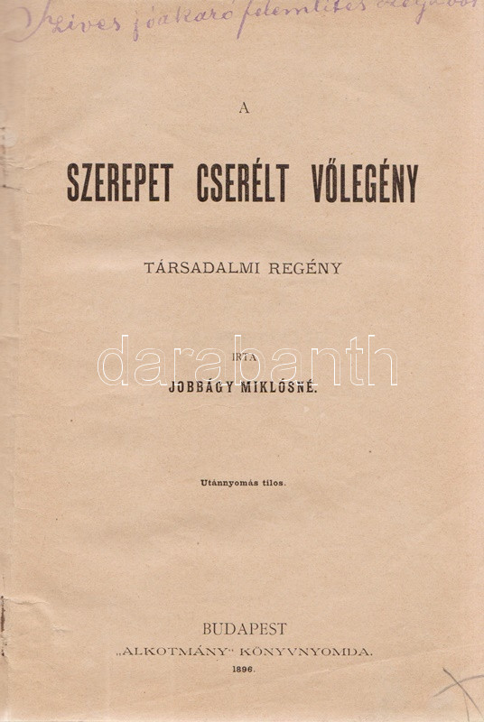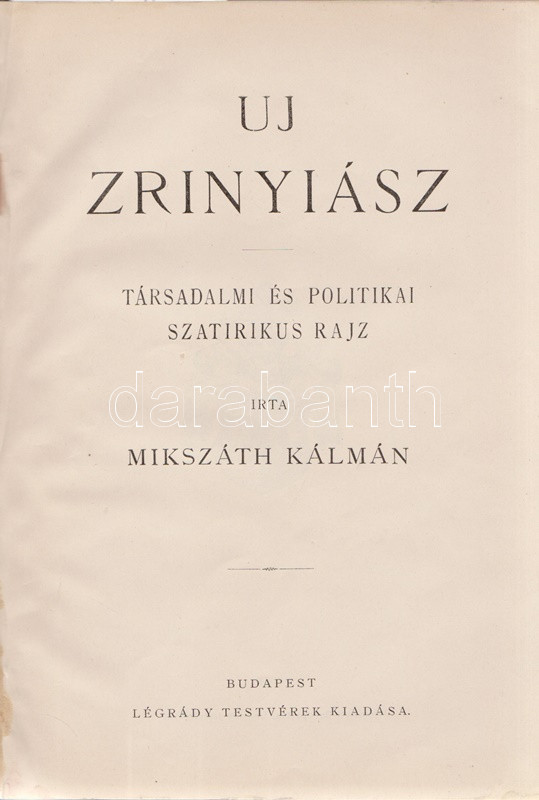 Mikszáth Kálmán: Új Zrínyiász. Társadalmi és politikai szatirikus rajz. Budapest, [1898]. Légrády Testvérek (ny.) [6] + 260 p. Első kiadás. Mikszáth Kálmán szatirikus regénye kivételes módon nyomtatásban először nem folyóirat-folytatásokban, hanem egyből kötet alakban került az olvasók elé. Szüry 3266. -- Elékötve: Jobbágy Miklósné: A szerepet cserélt vőlegény. Társadalmi regény. (Dedikált.) Budapest, 1896. ,,Alkotmány" könyvnyomda. 144 p. Egyetlen kiadás. A címoldalon a szerző saját művét kritikai ismertetésre ajánlja: ,,Szíves jóakaró felemlítés czéljából''. Példányunk első előzékén kézírásos tartalomjegyzék. Korabeli félvászon kötésben, márványmintás festésű lapszélekkel.