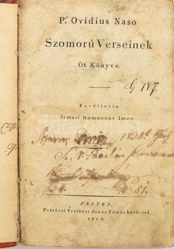 Ovidius Naso, P[ublius]: P. Ovidius Naso szomorú verseinek öt könyve. Ford. és az előszót írta: Irmesi Homonnay Imre. Pesten, 1825, Petrózai Trattner János Tamás betűivel, 214+(2) p. Első teljes magyar fordítás. Átkötött kartonált papírkötésben, kissé viseltes borítóval, helyenként foltos lapokkal, a címlapon korabeli tulajdonosi bejegyzésekkel, néhány sérült lappal.