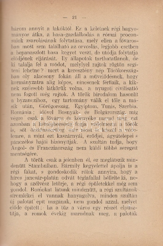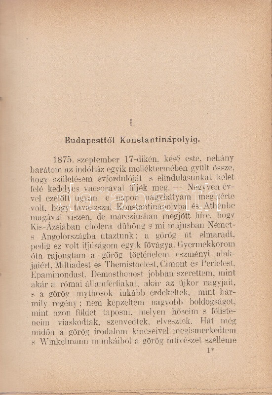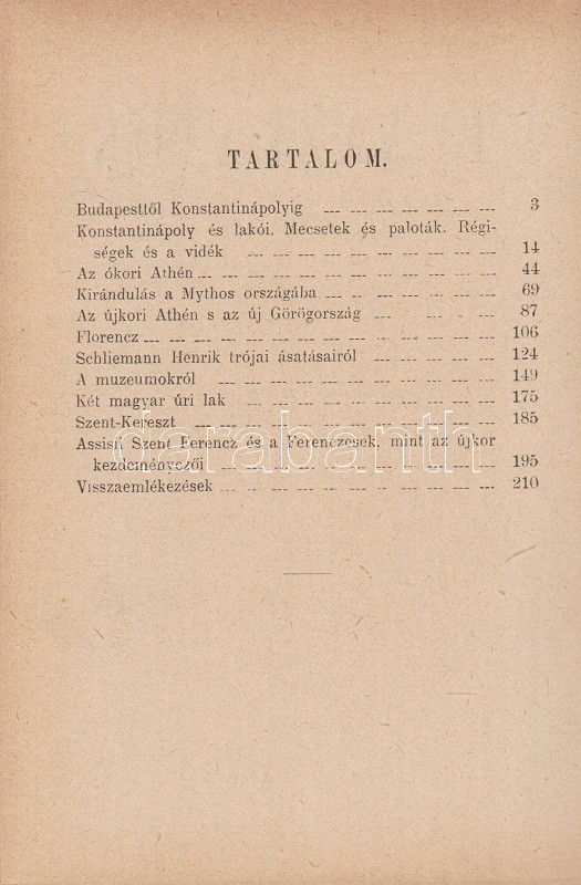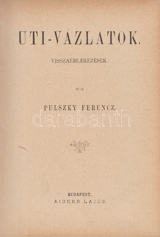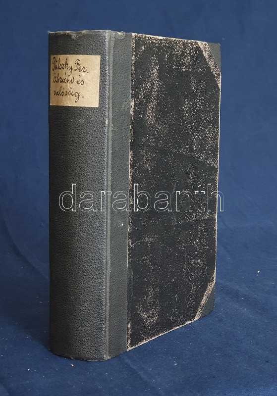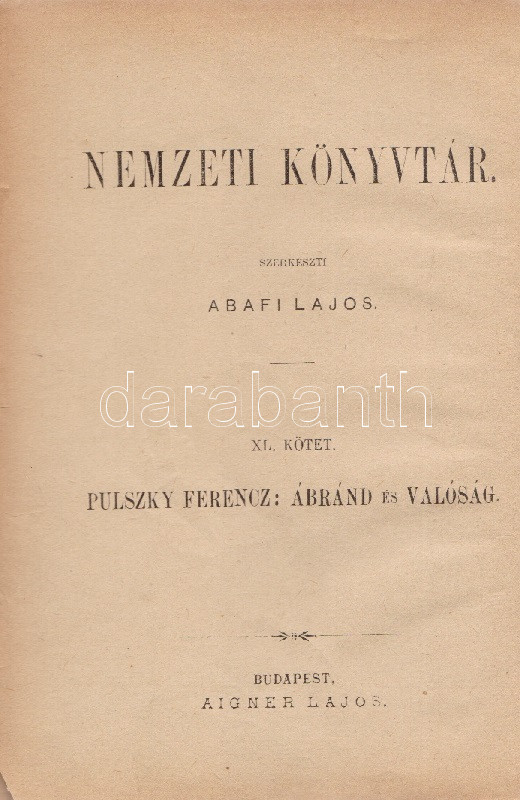 Pulszky Ferenc: Ábránd és valóság: Mese a csillagfiról és a királyfiról. - Jellemrajzok. Eötvös, Széchenyi, Deák, Dessewffy Aurél. - Úti vázlatok. Visszaemlékezések. Budapest, [1888]. Aigner Lajos. [4] + IV + [2] + 204 p.; [2] + 132 p.; 239 + [1] p. Egyetlen kiadás. ,,E kötet három fő részre oszlik. Az elsőben: ,,Mese a csillagfiról és királyfiról" regényes czím alatt Garibaldi és III. Napóleon történetét beszéli el. A másodikban újabb történelmünk négy kimagasló alakjának jellemrajzát adja, a harmadikban ,,Úti-vázlatok" czím alatt leírja 1875-iki utazását Konstantinápolyba, annak lakóit, mecseteit, palotáit, régiségeit és vidékét, az ókori és újkori Athént és új Görögországot, Florenczet, Schliemann Henrik trójai ásatásait; az európai és magyar muzeumokat; két magyar úri lakot (gróf Erdődy Sándor vépi kastélyát, és Bars-Szentkeresztet, Ipolyink egykori kedves Tusculánumát); majd egy tanulmányt ír Assisi Szent Ferencről és a ferencesekről, mint az újkor úttörőiről s visszaemlékezésekkel zárja be a változatos és érdekes kötetet olaszországi élményeiről, a száműzetésből való visszatérése idejéből, a magyar alkotmány visszaállításáról, Deák feleletéről Kossuth levelére, a Nemzeti Múzeumról stb. Legnagyobb súlyt fektet ő maga is az első részre, mely a vaskos kötetnek több mint egy harmadát betölti, melynél - mint ő maga kijelenti előszavában - soha sem írt jobbat. A 60-as évek közepén írta ő ezt olaszországi száműzetésében, midőn a politikában is enyhültek már a szenvedélyek s Magyarország remélve várta a jobb kor beköszönését. Pulszky ellenállhatatlan vágyat érzett megírni kedvelt hősének, Garibaldinak életét, kinek ő az aspremontei kalandnál kíséretében volt, a miért Nápolyban hat heti fogságot kellett szenvednie. De Garibaldi neve még tiltott volt Pesten, csakúgy mint Bécsben, mesealakba öltötte tehát elbeszélését, belevonva a legendát, úgy mint a történetet." (Századok, 1889, 160. o.) Kötetünk két belső címlapja kijár. (Nemzeti Könyvtár. XL. kötet.) Korabeli félvászon kötésben, a gerincen kézzel feliratozott címkével, márványmintás festésű lapszélekkel.