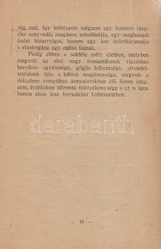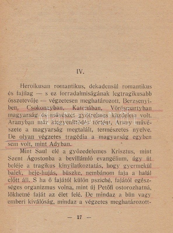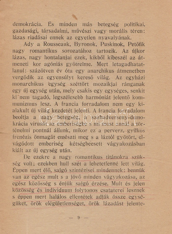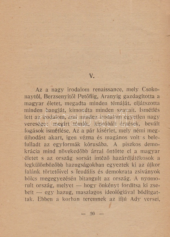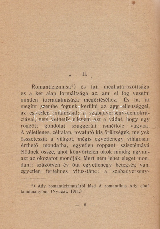 Szabó Dezső szenvedélyes hangon megírt tanulmánya Ady költészetének morális és esztétikai értelemben vett forradalmiságát körvonalazza, ám szót ejt Ady közéleti-politikai lírájáról is; a költőt pedig Európa utolsó romantikusának és a magyar fajiság géniuszának nevezi.
