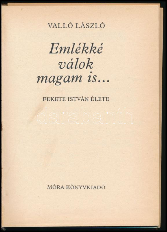 Valló László: Emlékké válok magam is... Fekete István élete. Bp., 1986... https://www.darabanth.com/en/464-Online-auction/464.0/Books/Books-Other-rarities~1500033/Vallo-Laszlo-Emlekke-valok-magam-is-Fekete-Istvan-elete-Bp-1986-Mora-Fekete-feher~II3107182
