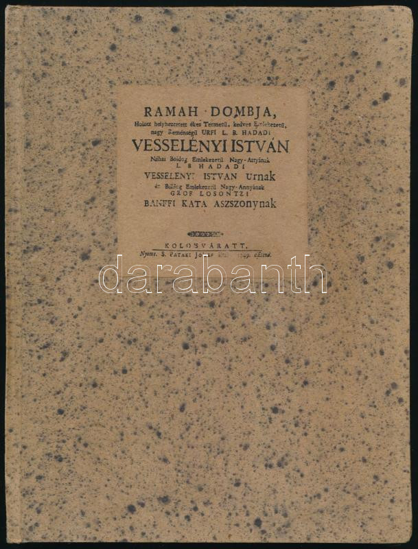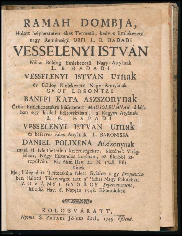 Description: Zoványi György: Ramah dombja, Holott helyheztetett ékes Termetü, kedves Emlékezetü, nagy Reménységü Urfi L. B. Hadadi Vesselényi István [...] (Halotti beszéd báró Wesselényi István (1674-1734) egykori országgyűlési és táblai elnök felett). Hozzákötve: Győrffi Ádám halotti prédikációja. Kolo'sváratt, 1749, S. Patki Jó'sef által, (32) p. Átkötött kartonált papírkötésben, kissé foltos lapokkal.