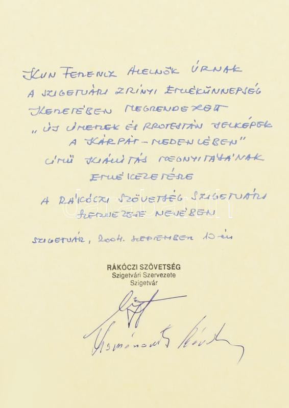 Zrínyi Miklós: Szigeti veszedelem. Szepes Erika utószavával. (DEDIKÁLT). Bp., 1997, Zrínyi. Kiadói aranyozott műbőr-kötés, a borító sarkán kis sérüléssel. Az előzéklapon Kun Ferencznek, a Rákóczi Szövetség alapítójának és alelnökének szóló dedikációval (a Rákóczi Szövetség Szigetvári Szervezetétől, kettős aláírással); valamint aláírt emléklappal a Szigetvári Zrínyi Emlékünnepség keretében megrendezett címerkiállításról és Nemzetközi Néptáncgáláról.