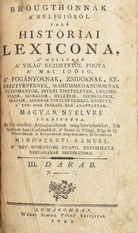 [Broughton, Thomas]: Brougthonnak a religióról való históriai lexicona, a mellyben a világ kezdetétől fogva a mai időkig a pogányoknak, a zsidóknak, keresztyéneknek, mahummedanusoknak tudományok, isteni tiszteletek, ceremoniájik, szokásaik, hellyeik, személlyeik, írásaik, azoknak történeteikkel együtt...Magyar nyelvre fordította...Mindszenti Sámuel.III. darab. (A mű 3 kötetben teljes) Komáromban, 1793. Wéber Simon Péter. 440 p.. Korabeli aranyozott gerincű egészbőr kötésben, gerince sérült, hiányos lapok, jó állapotban
