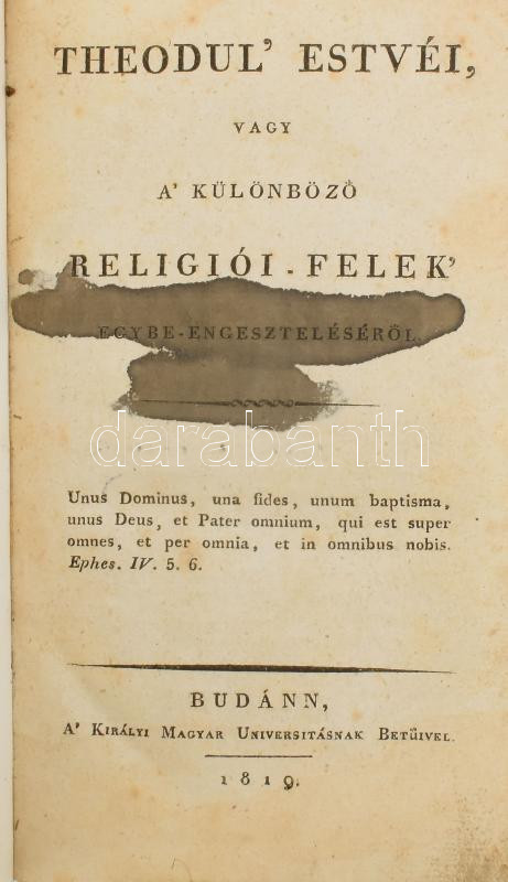 (Starck János Augustus, [Johann August von]): Theodul' estvéi, vagy a' különböző religiói-felek' egybe-engeszteléséről. (Ford.: Horváth András [Pázmándi Horváth Endre]). Budánn, 1819, A' Királyi Magyar Universitásnak betűivel, XX+480 p. (eredetileg: XX+488 p.) Átkötött félbőr-kötésben, a címlapon tintafolttal, kissé foltos lapokkal, a III-XIV. oldalak kijárnak.