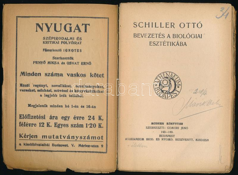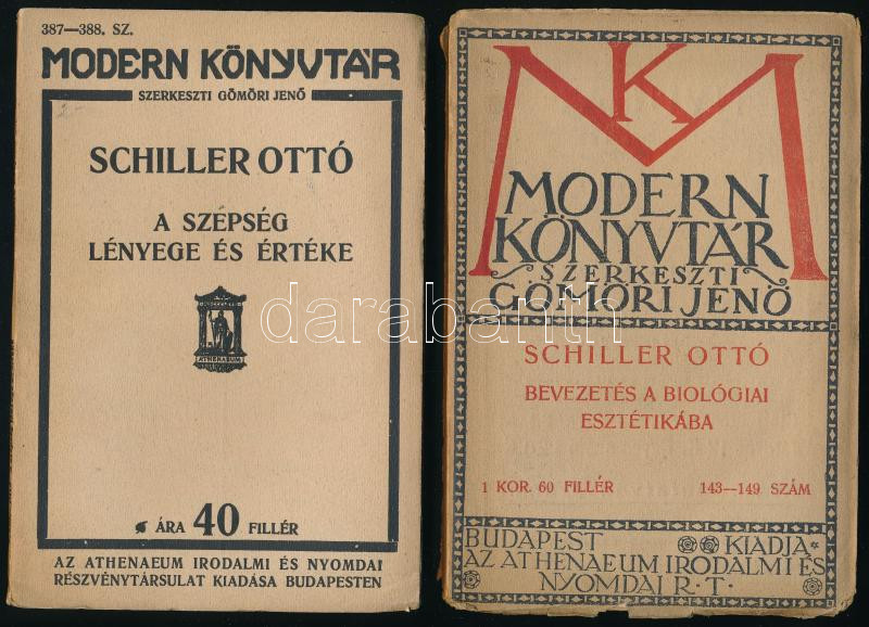 Bevezetés a biológiai esztétikába. Modern Könyvtár ... https://www.darabanth.com/en/464-Online-auction/464.0/Books/Books-Social-sciences~1500025/Schiller-Otto-Bevezetes-a-biologiai-esztetikaba-Modern-Konyvtar-143-149-Bp-1912-Athenaeum-~II3108815