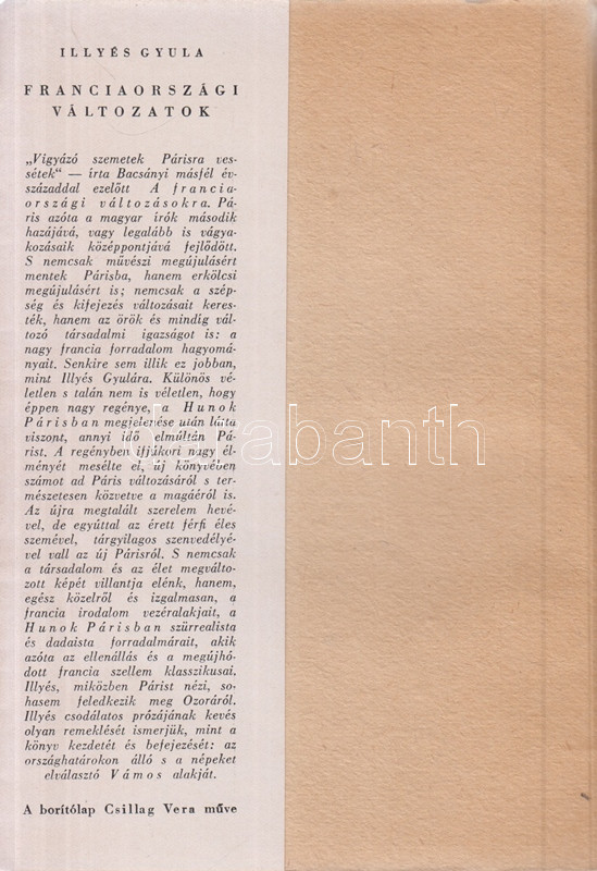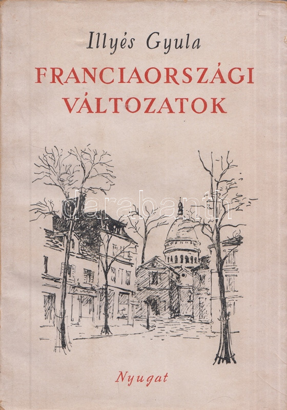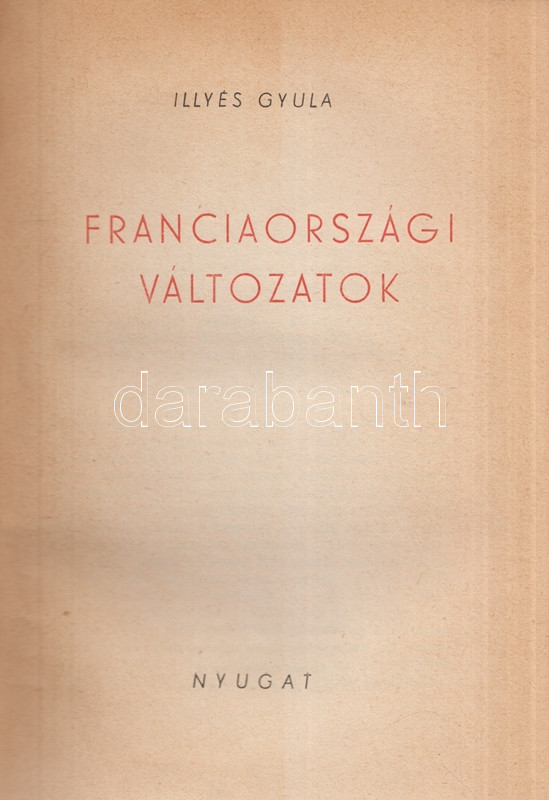Illyés Gyula: Franciaországi változatok. [Karcolatok.] (Budapest, 1947). Nyugat Könyvkiadó (Révai Irodalmi Intézet ny.) 147 + [1] p. Első kiadás. A francia szakot végző Illyés Gyula az 1920-as évek első felében hosszú éveket töltött Franciaországban, az ottani magyarság fontos szervezője volt, ott ismerkedett meg a költészetére átmeneti hatást gyakorló avantgárd költészettel. Bár az 1920-as évek második felétől Magyarországon teljesedett ki falukutató, esszéista és költészeti pályája, párizsi élményei továbbra is meghatározó szerepet töltöttek be életében, miként arról 1946-ban kiadott, életrajzi ihletettségű regénye, a Hunok Párizsban is beszámol. A második világháborút követő koalíciós időkben még lehetősége volt meglátogatni Franciaországot, esszéiben ezt az élményt dolgozza fel. Tezla 1456. Fűzve, Csillag Vera által illusztrált kiadói borítóban. Jó példány.