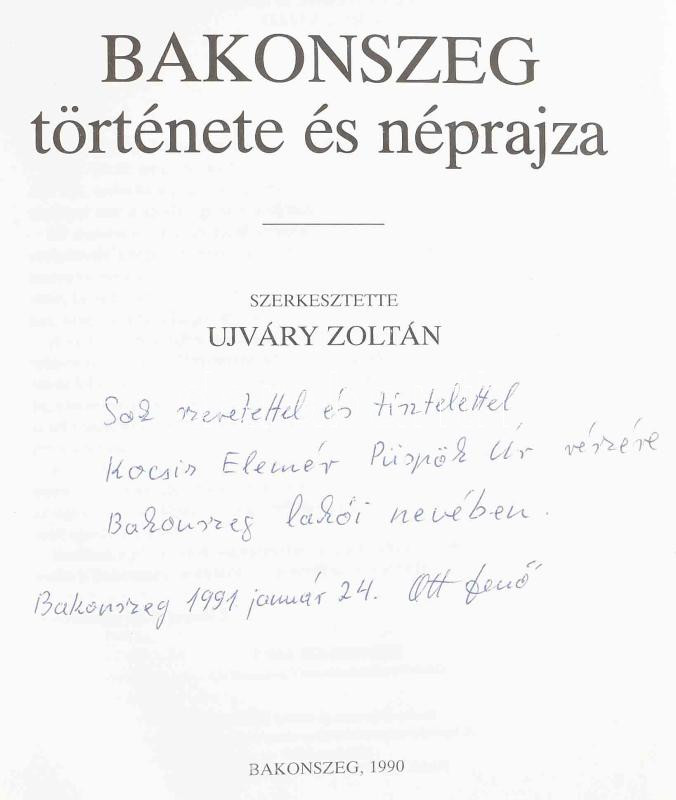 Description: Ujváry Zoltán (szerk.): Bakonszeg története és néprajza. A polgármester Ott Jenő által Kocsis Elemér (1926-2009) református püspök, teológus részére DEDIKÁLT! Bakonszeg, 1990, k.n.. Kiadói aranyozott keménykötésben, sérült gerinccel, kissé kopott borítóval, foltos és hullámos lapokkal, kissé deformált könyvtesttel.
