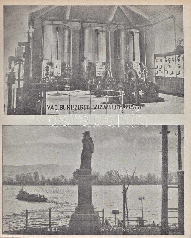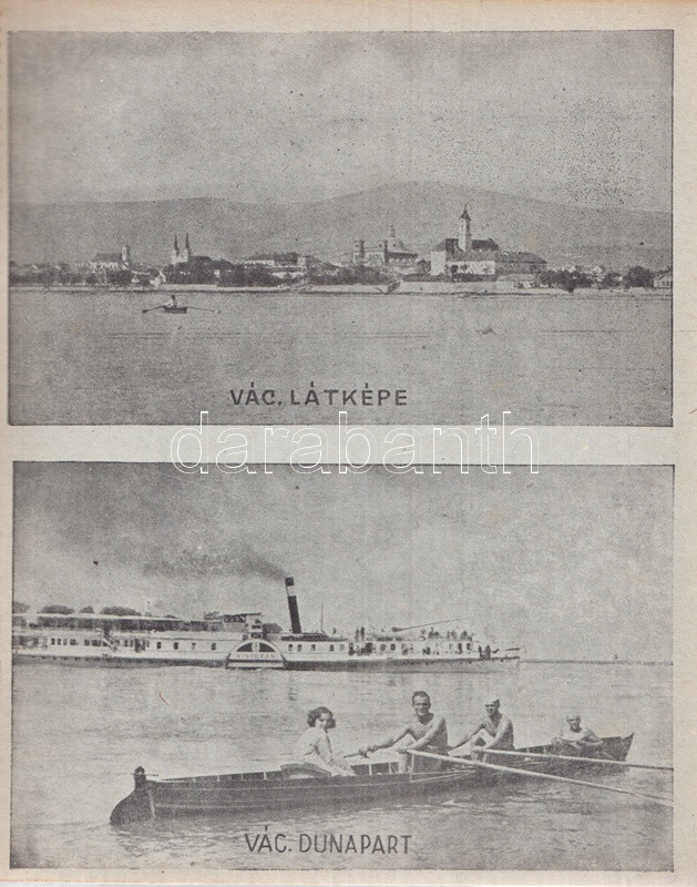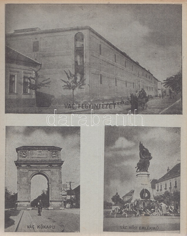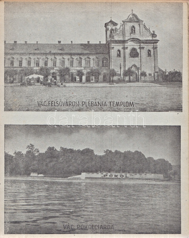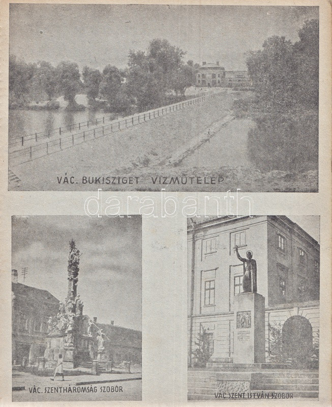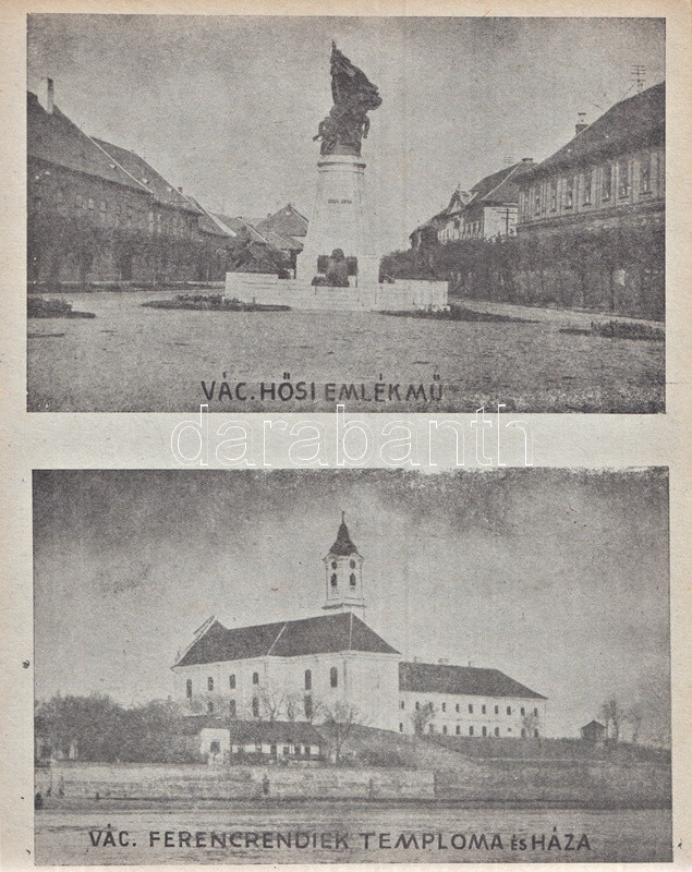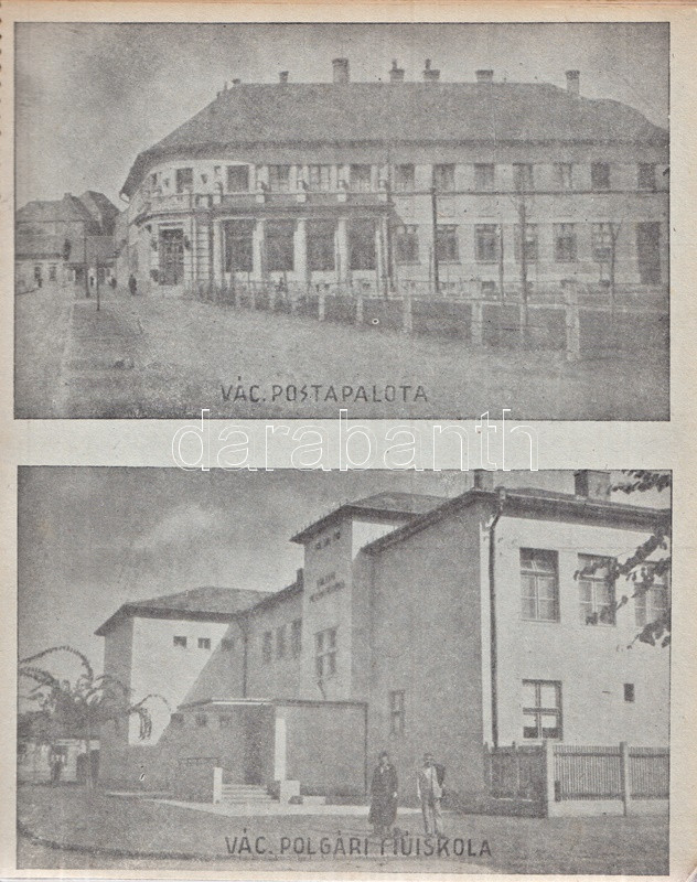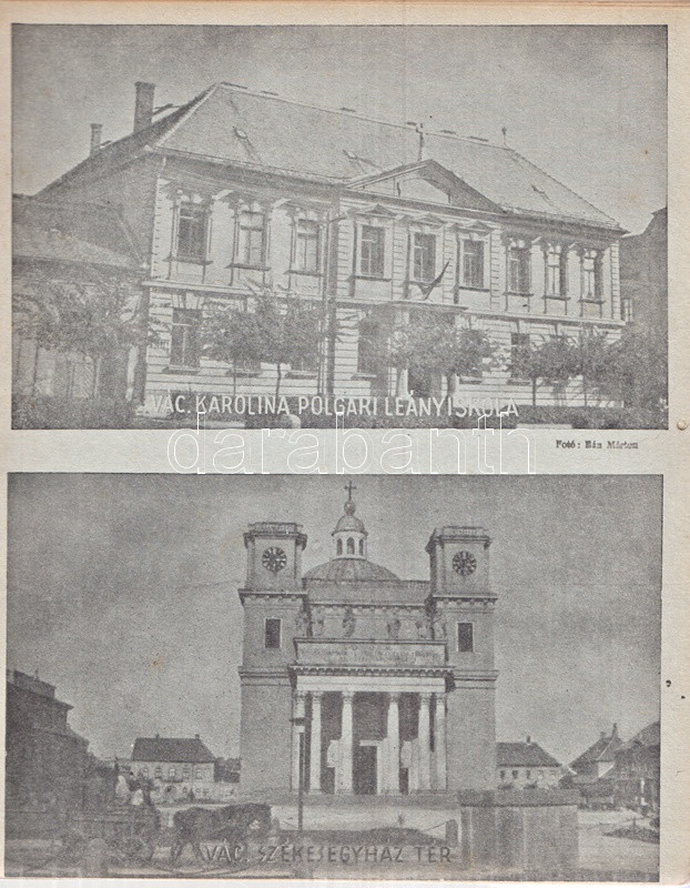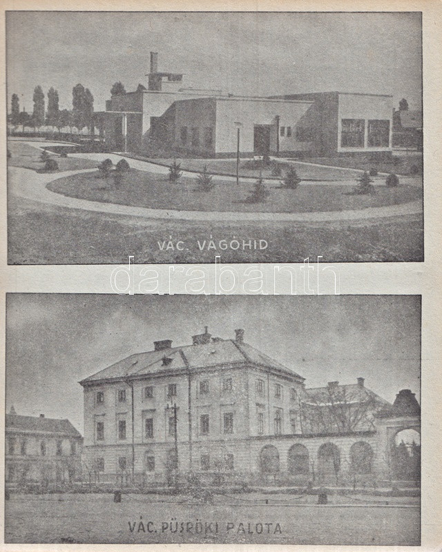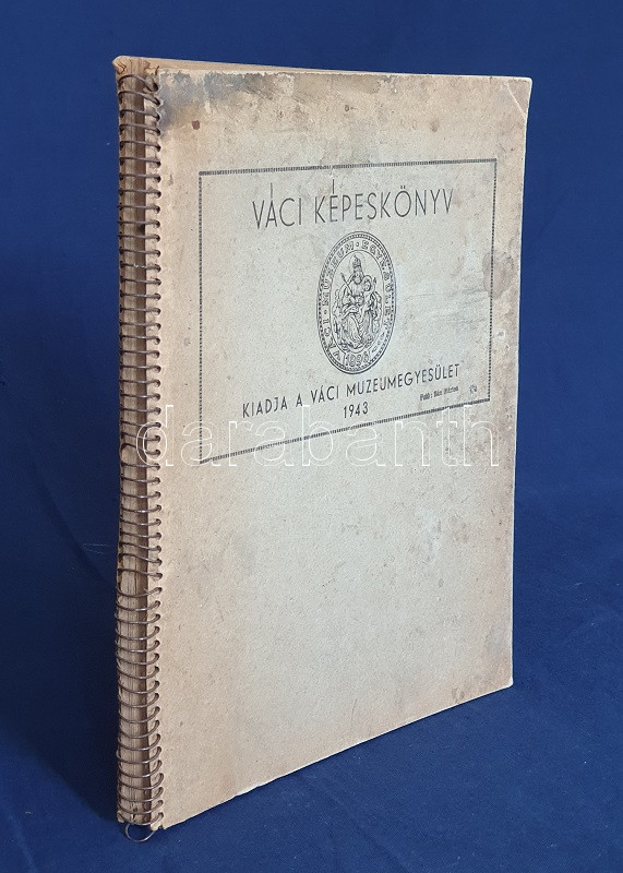 Váci képeskönyv. Bán Márton fotói. Vác, 1943. Váci Múzeum Egyesület [ny. n.] 28 t. Egyetlen kiadás. Képeskönyvünk összesen 61 fotó közlésével állít emléket az utolsó hazai békeévét élő Vác városának. A felvételek készítője, Bán Márton fotóművész érdeklődését legkivált a templomokban és oktatási intézményeben gazdag barokk város kötötte le, mellette még a vízi életről, egyes váci gyárakról és a fegyintézetről készült több felvétel. A felvételek pedig: Vasúti állomás - Pályaudvar * Konstantin tér: Kuria szálloda * Ferencrendiek temploma - Székesegyház belseje * Siketnéma Intézet - Honvédemlék - A Naszály kilátótornya * Városháza - Hajóállomás * Buki-sziget: Vízműtelep - Szentháromság szobor - Szent István-szobor * Rendőrségi palota - Horganylemezgyár * Kaszárnya - Mária Terézia rakpart * Hősi emlékmű - Ferencrendiek temploma és háza * Gróf Csáky Károly-út - Dunapart a fegyházzal * Széchenyi-utca - Irgalmasok rendháza * Felsővárosi plébániatemplom - Pokolcsárda * Járásbíróság - Hétkápolnai templom - Hétkápolna forrás * Dunapart télen - Deákvári templom * A gimnázium evezősháza - Városi múzeum - Hegyes vártorony * Vágóhíd - Püspöki palota * Postapalota - Polgári fiúiskola * Karolina polgári leányiskola - Székesegyház tér * Fegyintézet - Kőkapu - Hősi emlékmű (megkoszorúzva) * Fegyintézet - Jégzajlás a Dunán (fákkal) * Piarista gimnázium - Szeminárium * Kálvária domb - Gombospatak kőhídja * Buki-sziget: A vízmű gépháza - Révátkelés * Vác látképe a Duna felől - Dunapart * Piaristák könyvtára - Jégzajlás a Dunán (a korzó kerítésével) * Kálvária - Piarista rendház és templom * Hadiárvák ipariskolája - Derecskei-tó * Belga kert - Kodak gyár * Vác látképe. Fűzve, foltos kiadói borítóban. Jó példány.