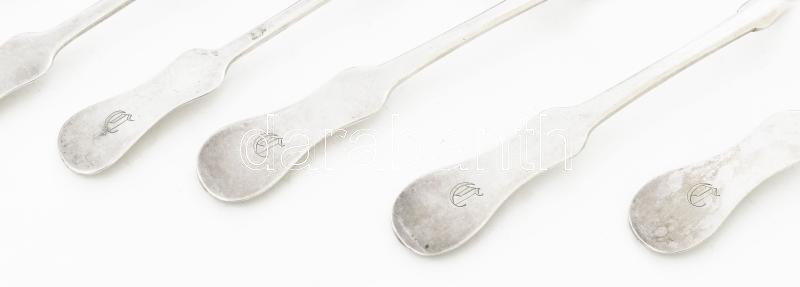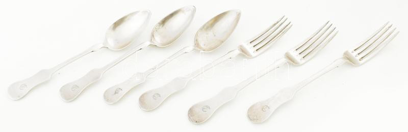 Régi ezüst (Ag) monogramos kanál és villa szett, össz. 6 db, jelzettek, 399 g