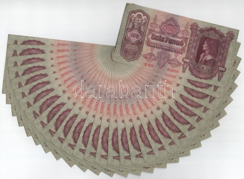 https://www.darabanth.com/en/464-Online-auction/464.0/Numismatics/Hungarian-Banknotes~500008/1930-100P-28x-kozte-sorszamkoveto-harmasok-parok-E-929-015029-015100-kozott-T-UNC-AU-Adamo~II3125214