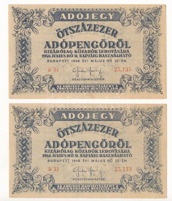 https://www.darabanth.com/en/464-Online-auction/464.0/Numismatics/Hungarian-Banknotes~500008/1946-500000AP-2x-vizjeles-papiron-kozeli-sorszammal-B-32-25125-es-B-32-25133-T-VF-F~II3130117
