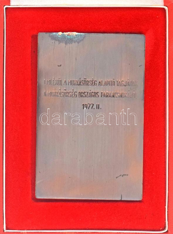 Description: Kiss Nagy András (1930-1997) 1977. "De elvtársaim! Ez az a munkásság, mely osztályharcban vasba öltözött... / Emlékül a Munkásőrség alapító tagjának a Munkásőrség országos parancsnokától 1977. II." vörösréz emlékplakett eredeti,