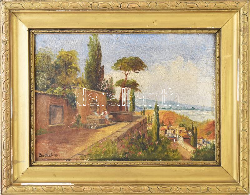 Bartha jelzéssel: Mediterrán táj. Olaj, vászon, sérült. Dekoratív, kissé sérült fakeretben. 25x35 cm