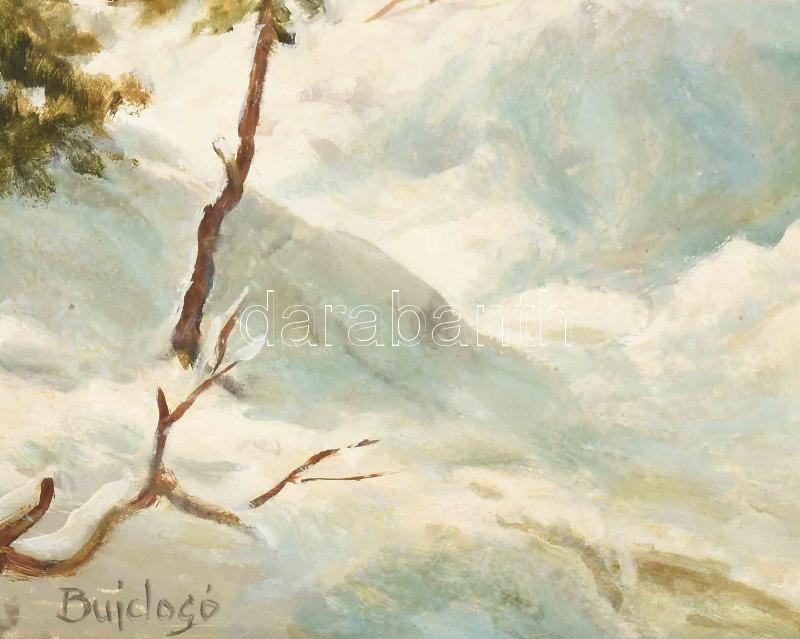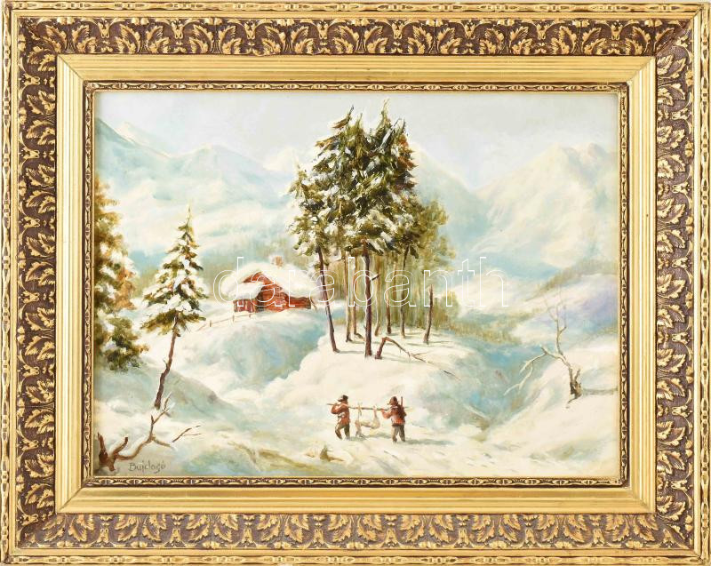 Bujdosó Dénes (1932-): Téli vadászat. Olaj, farost, jelzett. Dekoratív fakeretben. 30×40 cm