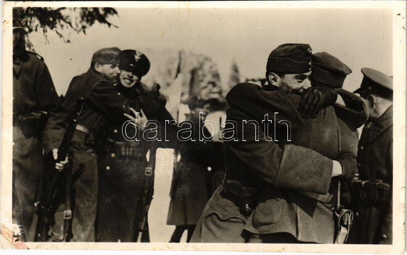 1939 Vereckei-hágó, Veretskyy pereval, Verecke Pass, Serednioveretskyy; Magyar-Lengyel baráti találkozás a visszafoglalt ezeréves határon, ölelkező katonák / Hungarian-Polish meeting on the historical border, soldiers hugging each other, irredenta (kis szakadás / small tear)