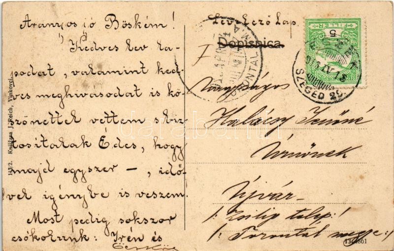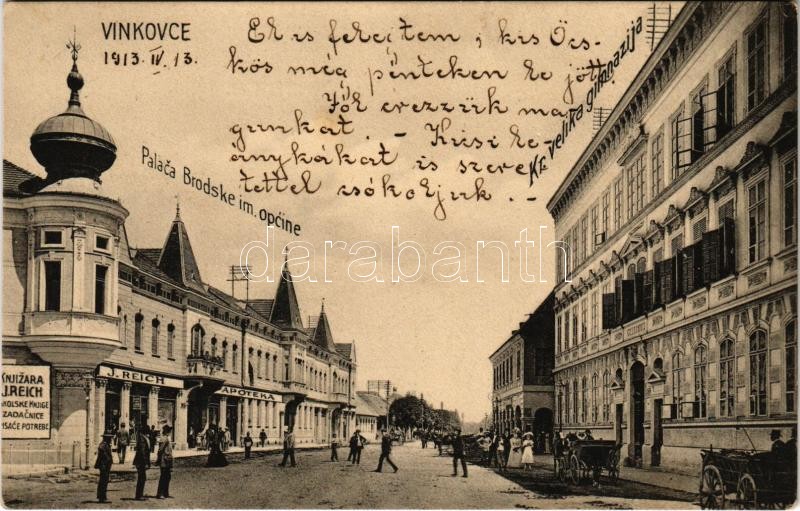 1913 Vinkovce, Vinkovci; Palaca Brodske im. opcine, Apoteka, Knjizara / Brod palota, gyógyszertár, J. Reich üzlete és saját kiadása 143/2. / town hall, pharmacy, J. Reich's bookstore, shops + "ESZÉK - SZEGED 29." vasúti mozgóposta bélyegző