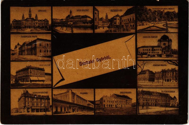 1911 Győr, Városháza, Rába rakpart, Erzsébet tér, Kisfaludy szobor a parkkal, Törvényszéki palota, Izraelita templom, zsinagóga, Royal szálloda, Pénzügyi palota, Kisfaludy kávéház, vasútállomás, Apollo mulató, Állami főreáliskola (fa)