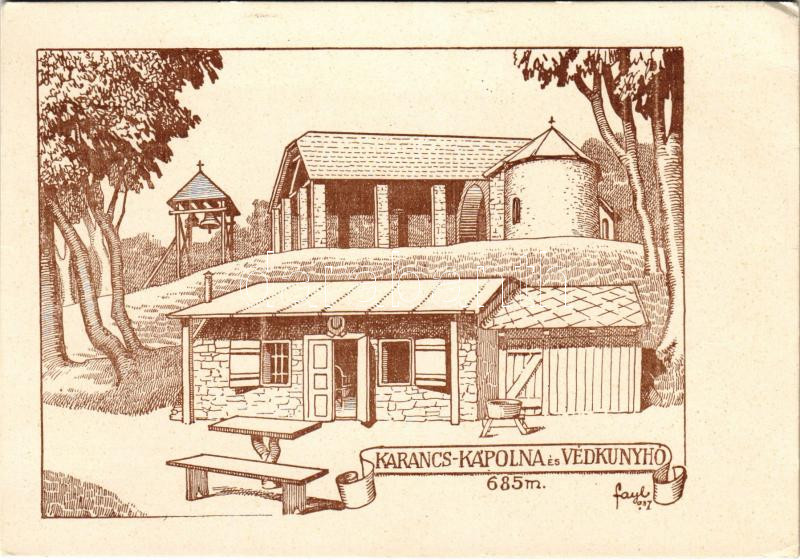 Karancs, Karancshegyi kápolna és védkunyhó 685 méter magasban. Dr. Dornyay Béla Honismertető című képeslevelező-lap sorozata 16. sz. s: Fayl