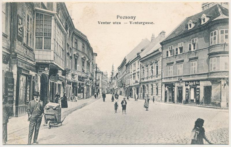 Pozsony, Pressburg, Bratislava; Ventúr utca, Hauser Mihály, Bader N., Aczél üzlete, vendéglő, étterem / Venturgasse / street view, shops, restaurant (ázott sarok / wet corner)