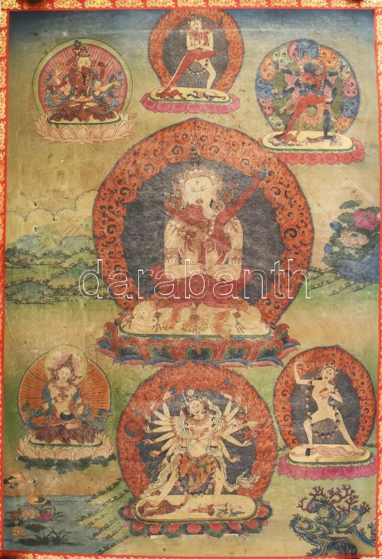Thangka, Heruka és Vajrayogini ábrázolással. Tibet vagy Kína, XX. sz. első fele, nyomat, vászon. 89x63 cm, korának megfelelő állapotban, hátulján kopott, foltos, papírszegéllyel megerősítve, feltekerve.
