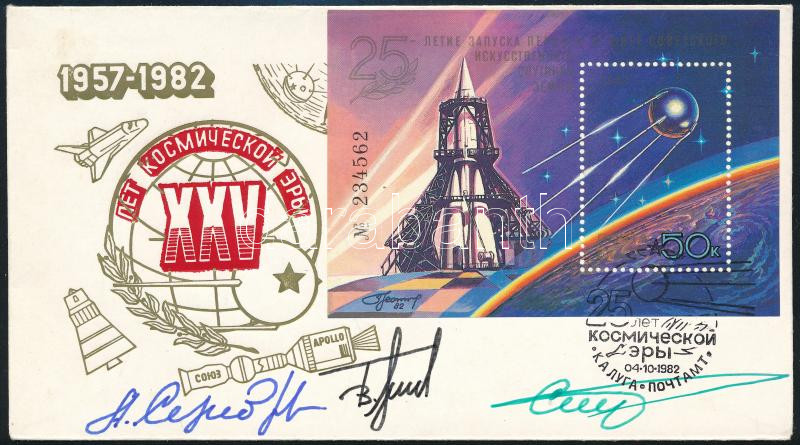 Description: Alekszandr Szerebrov (1944-2013), Vlagyimir Tyitov (1947- ) és Gennagyij Sztrekalov (1940-2004) szovjet űrhajósok aláírásai emlékborítékon / Signatures of Aleksandr Serebrov (1944-2013), Vladimir Titov (1947- ) and Gennadiy Strekalov (1940-2004) Soviet astronauts on envelope