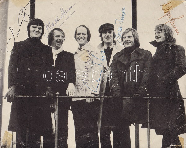 Az 1968-ban alapított The King's Singers brit a cappella együttes fotója a zenekar közel eredeti felállásában, az énekesek aláírásával. Készült 1975 körül. Vintázs, ezüst nagyítású felvétel, mérete: 202x254 mm. Az oxfordi King's College kórustagjainak baráti társasága az 1960-as évek közepén alapította kizárólag énekhangon alapuló zenei társulatát, melyet egykori iskolájuk iránt tisztelegve The King's Singersnek neveztek el. A kezdetektől hat énekesből álló énekkarban a mai napig változatlan a felállás, két kontratenor, egy tenor, két bariton és egy basszus szólam alkotja a zenekar egyedi, azonnal felismerhető, világszerte ünnepelt hangzását. Az alapítás óta eltelt több mint 50 évben természetesen cserélődtek a tagok, de a zenekar a mai napig a legünnepeltebb a cappella társulatnak számít. Aláírt fotónk 1975 körül készült, a zenekar közel eredeti felállásában: Simon Carrington (bariton, alapító tag), Alastair Hume (kontratenor, alapító tag), Brian Kay (basszus, alapító tag), Anthony Holt (bariton), Alastair Thompson (tenor, alapító tag), Nigel Perrin (kontratenor). Jó állapotú fénykép, egykori ragasztócsíkok nyomával, jobb oldalán enyhe gyűrődésnyommal.