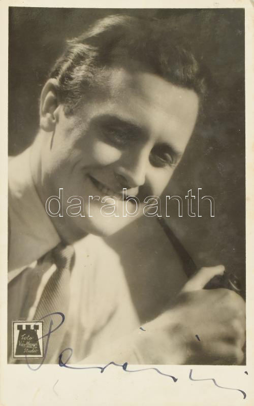 Perényi László színművészt ábrázoló Filmbolt fotólap autográf aláírással, hátán ragasztónyommal.