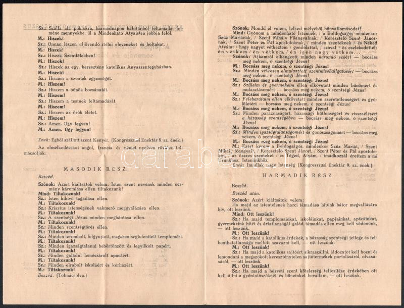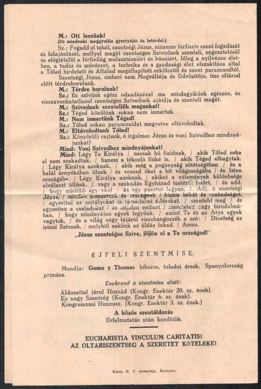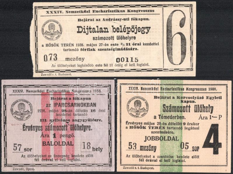 1938 Budapest, XXXIV. Nemzetközi Eucharisztikus Kongresszus tétel: tagsági jegy, belépőjegyek (díjtalan belépőjegy számozott ülőhelyre a Hősök terén 1938. május 27-én este 3/4 11 órai kezdettel tartandó férfiak szentségimádásra; Iparcsarnokban 1938. május 28-án du. 16 órai kezdettel tartandó III. nyilvános nagygyűlésre, érvényes számozott ülőhelyre; számozott ülőhely a Tómederben, érvényes május 29-én de. 9 órakor a Hősök terén tartandó legátusi szentmisére), utazási rend, énekrend, programfüzet, stb.