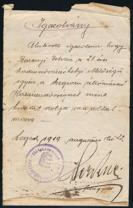 1919.VIII.22. Szeged, igazolvány a Határrendőrségnél hivatalszolgai al... https://www.darabanth.com/en/465-Online-auction/465.0/Art-and-other-collectibles/Documents~500024/1919VIII22-Szeged-igazolvany-a-Hatarrendorsegnel-hivatalszolgai-alkalmazasban-allo~II3137149